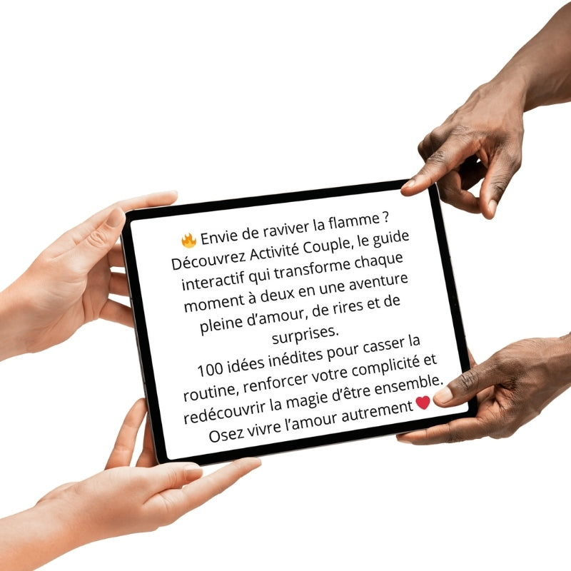 Plongez dans un guide unique de 69 pages consacré à renforcer la complicité et la magie du couple. Ce livre électronique regroupe des idées d’activités originales, romantiques, créatives et amusantes pour raviver la flamme, sortir de la routine et créer des souvenirs inoubliables à deux.